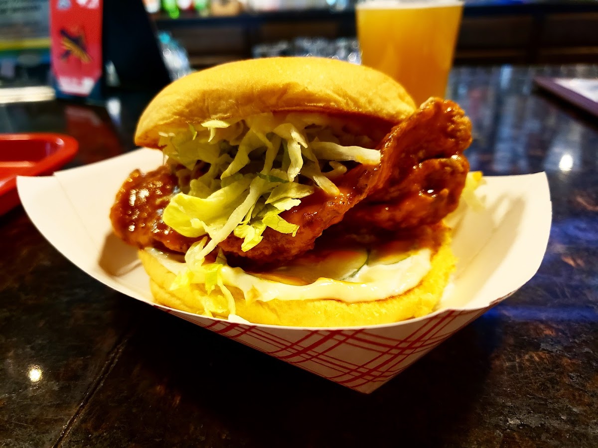 It was hard not to order one of the best burgers in Columbus but the hot chicken sandwich from Prestons Burgers at Woodlands Backyard is going on the short list for amazing hot chicken sandwiches. House pickles, mayo, iceberg lettuce, amazing bun, hot chicken.